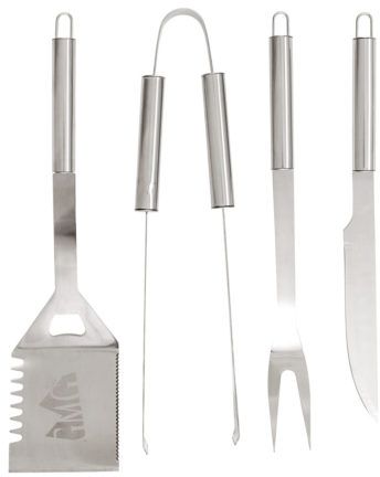 Includes: Spatula with serrated sides and bottle opener, Tongs, Fork, and Knife